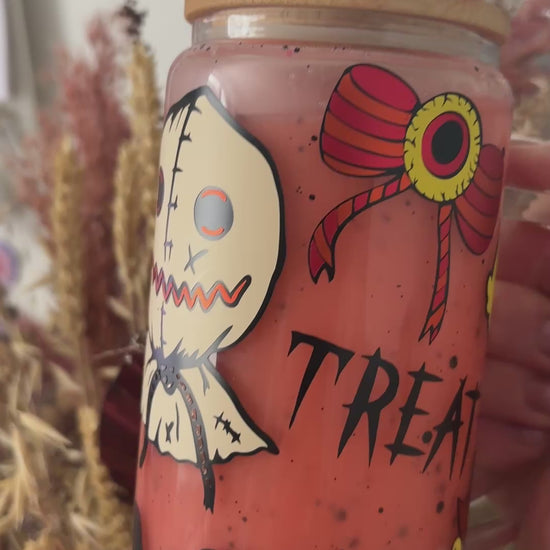 Spooky Trick or Treat design Glass Handled Snowglobe with a peach/orange slow flow liquid, lid is decorated with a whipped cream design and fake sweets.